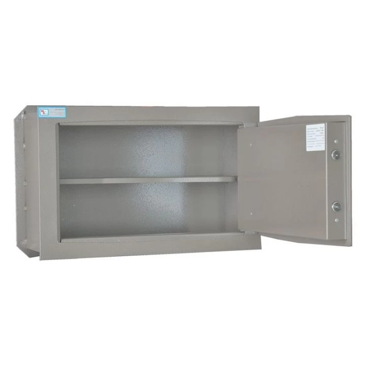 Дверь шкафа оснащена сейфовым замком сувальдного типа. Корпус сейфа толщиной 2 мм, лицевая панель и дверь толщиной 5 мм. На задней стенке корпуса расположены отверстия для крепления.